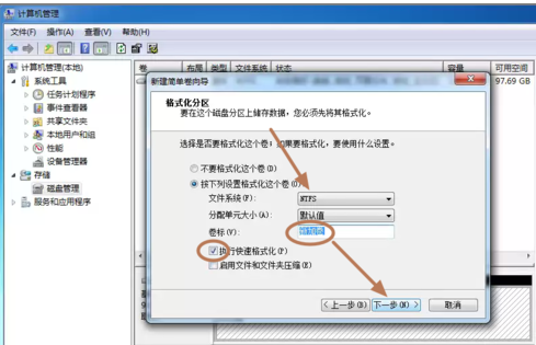 7、格式化分区,这里有分区格式设置,大容量只有NTFS的分区格式才支持。同时可以自定义盘的名字(卷标)。使用快速格式化。点击:“下一步”,第一个分区完成。
