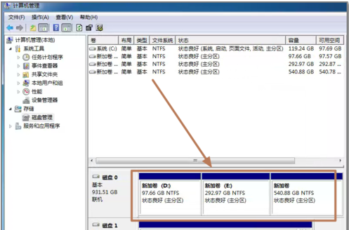 8、重复以上3到7步骤,创建下一个分区。注意需要选择未划分的容量点击右键新建分区。全部建立完之后,如图所示。