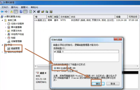 2、选择“磁盘管理”,系统会弹出检测到新的硬盘,并要求初始化硬盘,如图,点击:“确定”初始化。