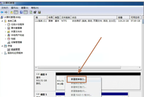 3、记住磁盘的序号,如这里是磁盘0,选择这块磁盘,点击右键,弹出菜单,选择“新建简单卷”。