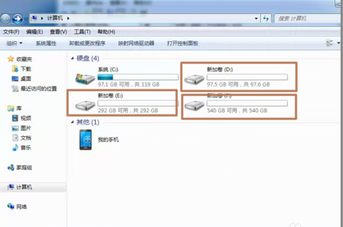 9、现在打开我的电脑,可以看到新建立的分区每个盘,现在就可以使用大容量的机械硬盘存储文件了。