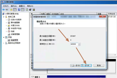 5、设定你的第一个分区容量大小,如你这个分区是用来放游戏安装目录的,一般给一个400G足够了。设定好之后,点击:“下一步”。