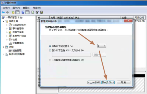 6、为这个分区指定盘号,如有C盘了,系统会按顺序默认指定为D盘。也可以手工指定,设定完成,点击:“下一步”。
