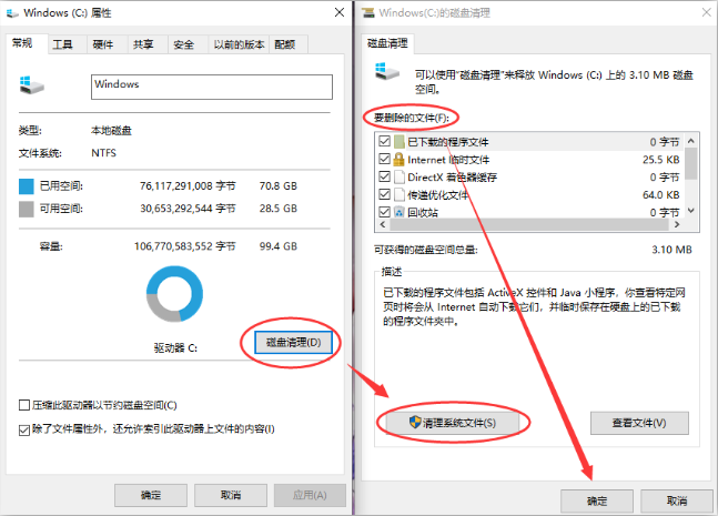 打开新的面板后,点击「磁盘清理」,先选择「清理系统文件」,清理完成后,勾选要删除的文件,点击「确定」就可以删除了。