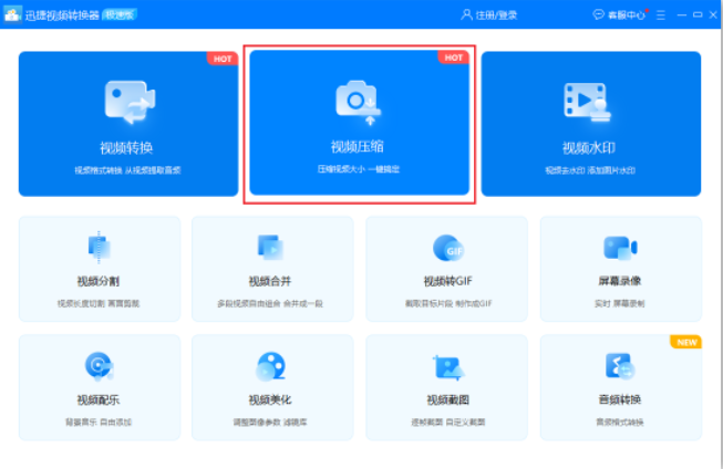 电脑中最占用空间的就是视频文件了,对于一些超大文件的视频,我们可以采取压缩,在电脑上打开「迅捷视频转换器」,选择「视频压缩」功能。