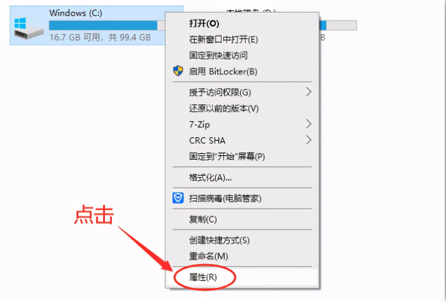 首先在桌面上打开「此电脑」,进入后找到Windows(C)盘,然后鼠标右击选择「属性」。